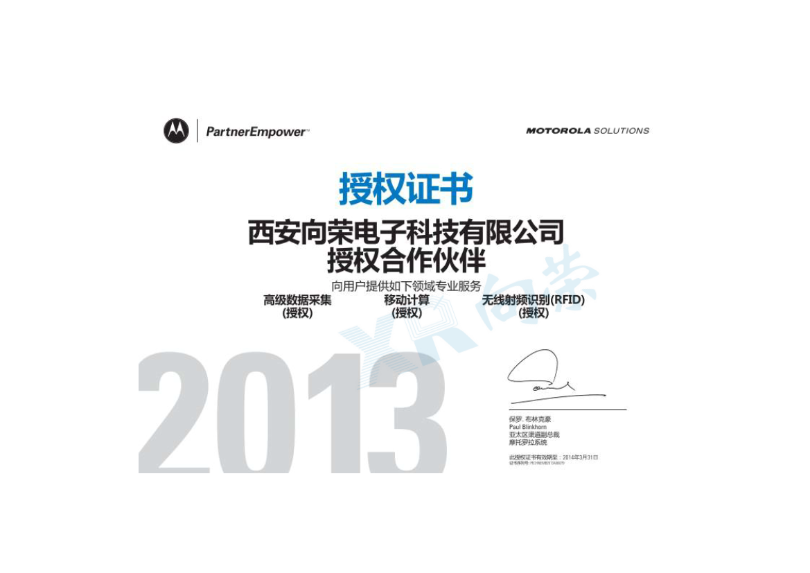 當(dāng)前位置 > 主頁(yè) > 榮譽(yù)資質(zhì) > 恭喜西安向榮榮獲摩托羅拉合作伙伴授權(quán)書