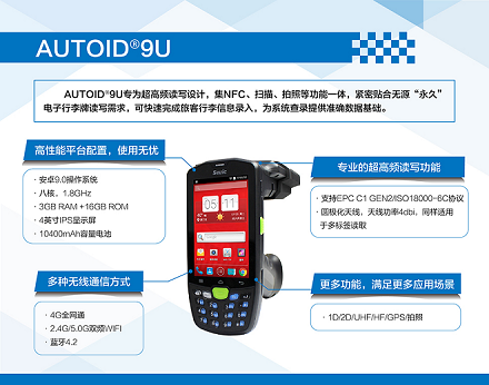 柜臺/機場地勤服務工作人員使用AUTOID®9U手持機對電子行李牌中的RFID標簽進行信息寫入并激活,行李交付流程即可完成。