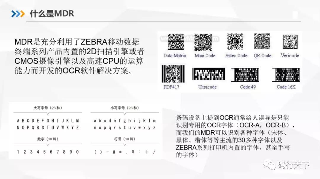 MDR(Mobile Direct Recognition)移動直接識別是充分利用了ZEBRA移動數(shù)據(jù)終端系列產(chǎn)品內(nèi)置的2D掃描引擎或者CMOS攝像引擎以及高速CPU的運算能力而開發(fā)的OCR(Optical Character Recognition)軟件解決方案。
