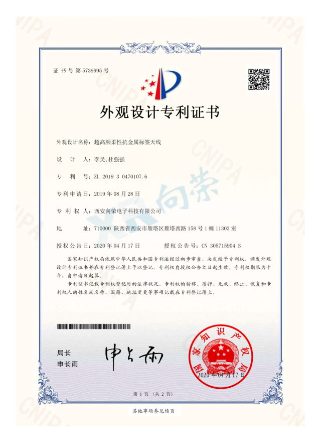 當(dāng)前位置 > 主頁(yè) > 榮譽(yù)資質(zhì) > 恭喜西安向榮榮獲“超高頻柔性抗金屬標(biāo)簽天線外觀設(shè)計(jì)專利證書”