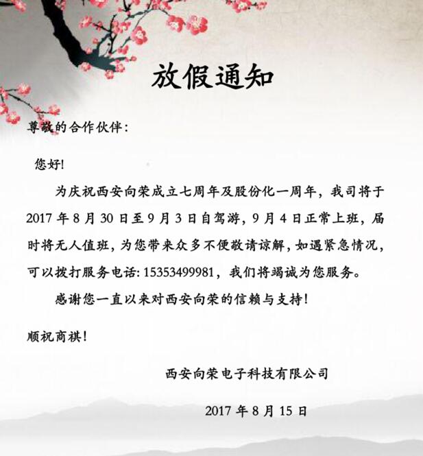 當(dāng)前位置 > 主頁(yè) > 新聞中心 > 2017年西安向榮七周年年慶放假通知