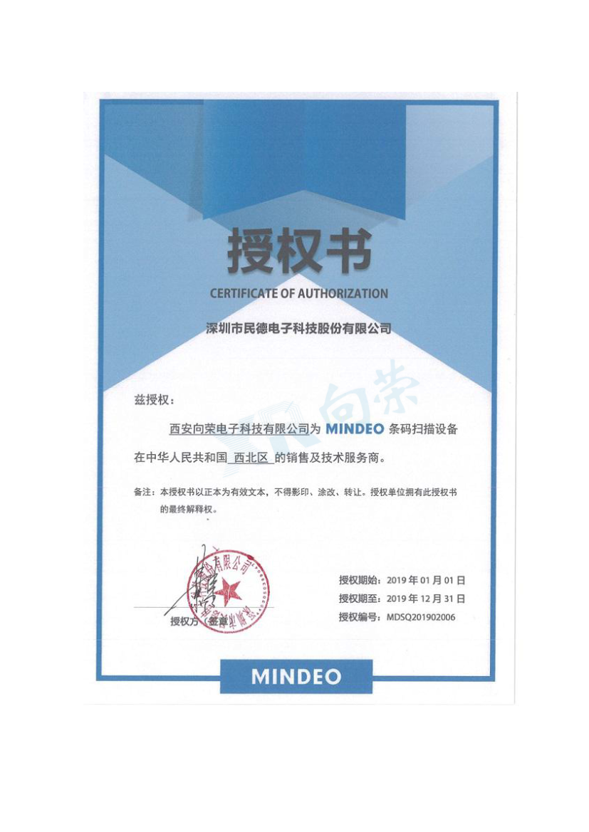 當前位置 > 主頁 > 榮譽資質 > 恭喜西安向榮獲得民德(Mindeo)代理授權