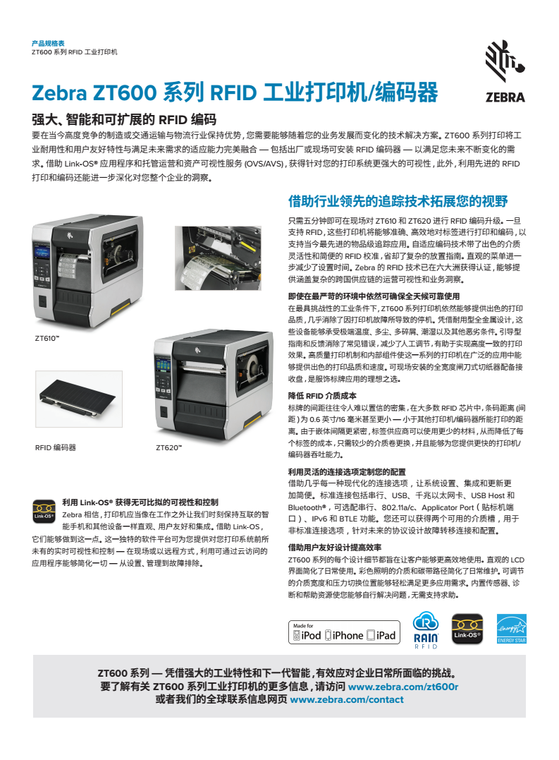 ZT600 系列打印機設有一個可在工廠或現場安裝的 RFID 編碼器,將工業(yè)耐用性、用戶友好功能以及前瞻性的適應能力相結合,可與時俱進地滿足您在今后數年內不斷演變的各種需求。Link-OS 應用、托管運營和資產可視性服務 (OVS/AVS) 可提供更好的打印系統可視性,先進的 RFID 打印和編碼則可深化您對整個業(yè)務的洞見。