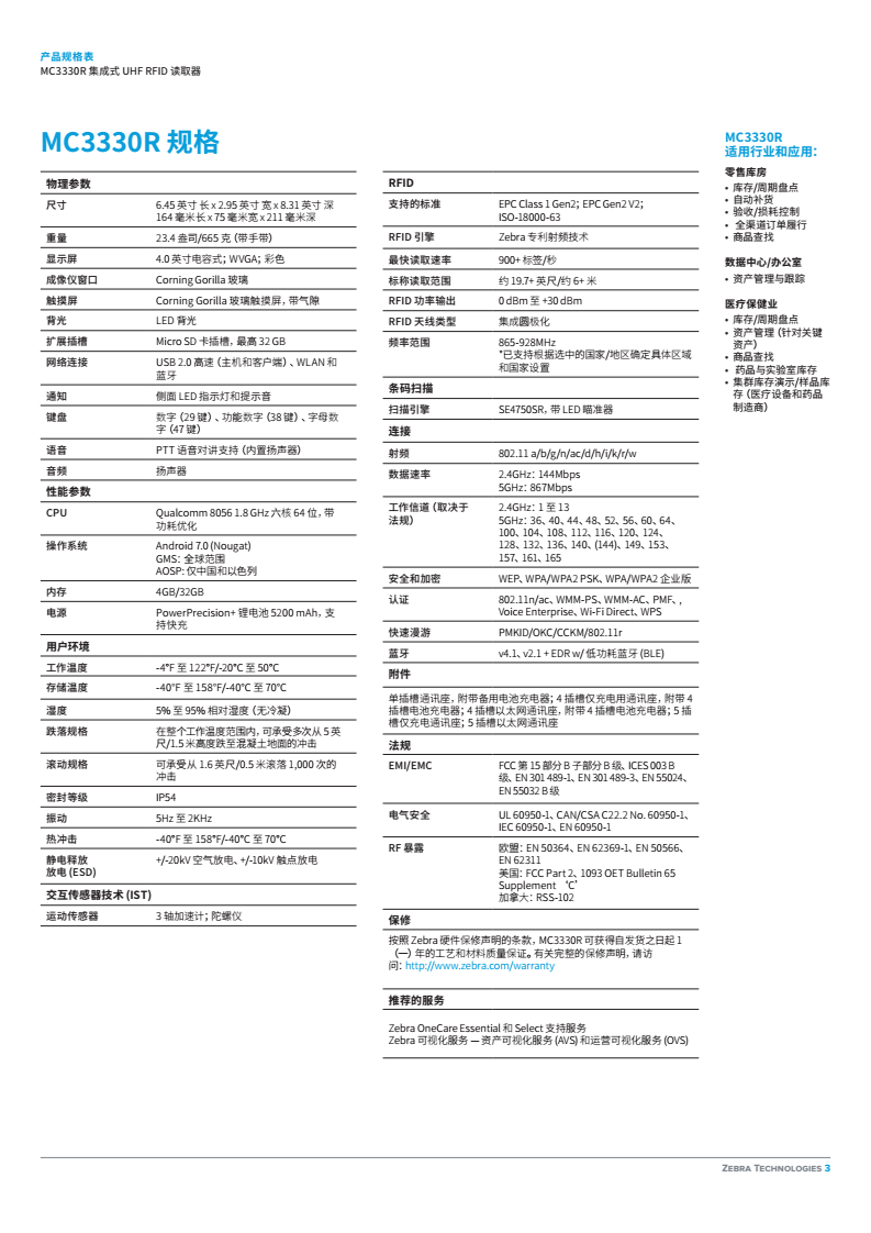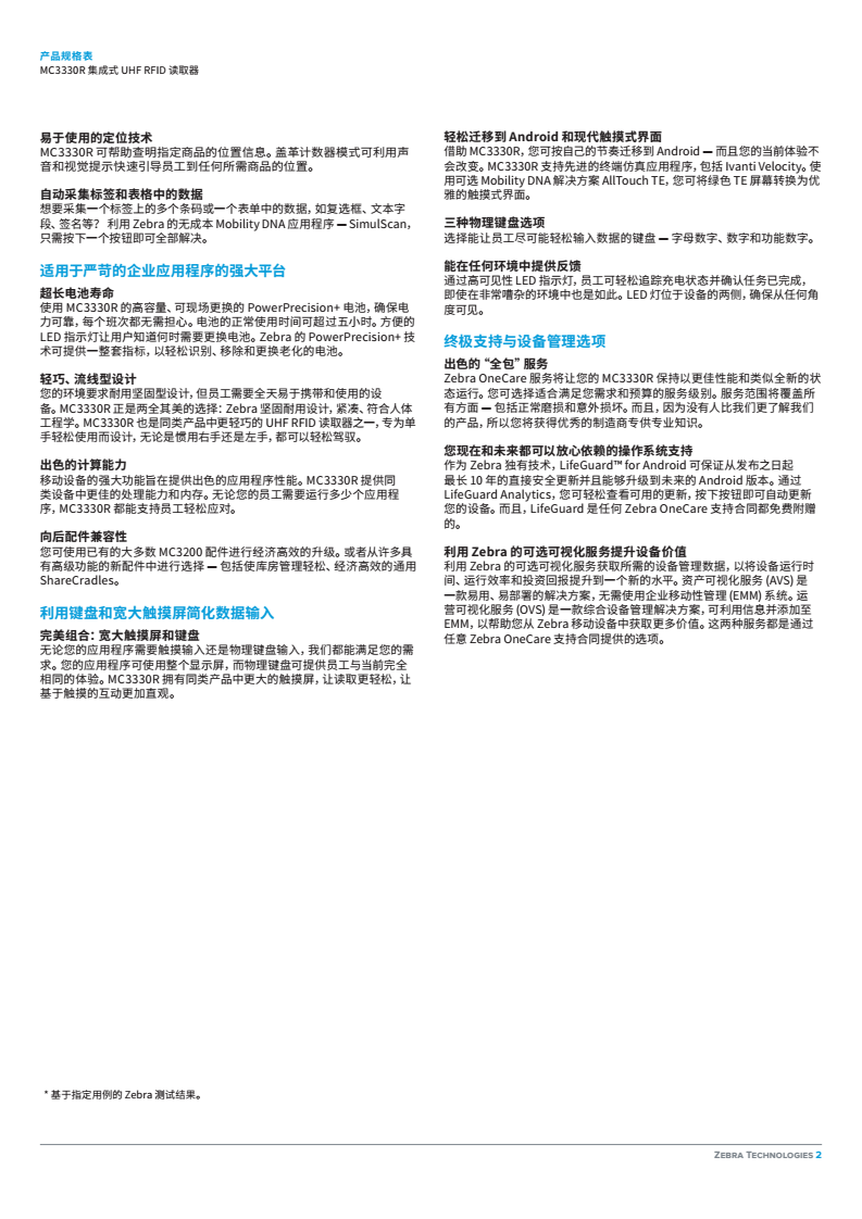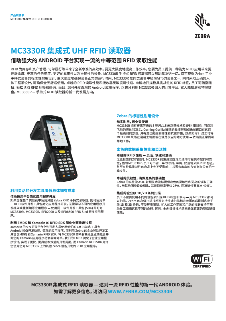 MC3330R RFID 手持讀取器可為您的 RFID 應用帶來全新水準的舒適度、速度、易用性和準確性。卓越的 RFID 讀取性能和接收器靈敏度可快速、準確地掃描極具挑戰(zhàn)性的 RFID 標簽。MC3330R 采用 Zebra 標志性的耐用設計,專為實現(xiàn)更長運行時間打造,同時兼顧輕巧、符合人體工程學特點,可確保全天舒適使用。大觸摸屏、物理鍵盤和 Android 操作系統(tǒng)可為您今天和未來的 RFID 應用需求提供直觀、靈活的平臺。