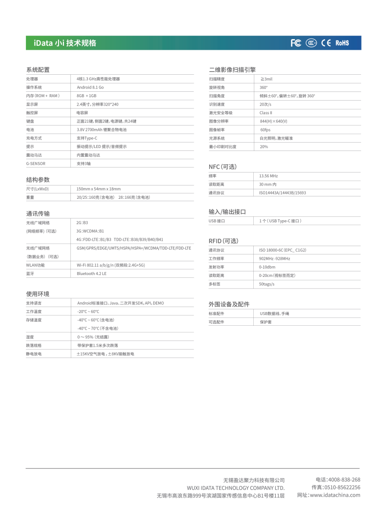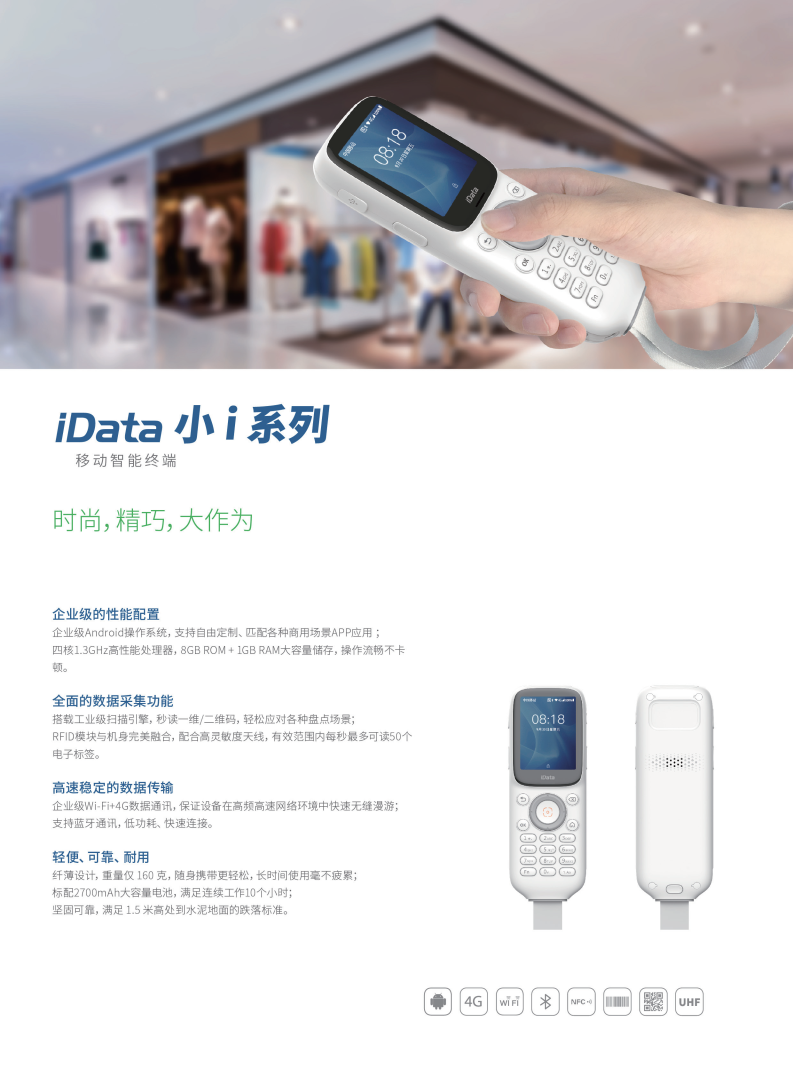 iData 25智能終端,企業(yè)級Android操作系統(tǒng),支持自由定制、匹配各種商用場景APP應用。四核1.3GHz高性能處理器,8GB ROM + 1GB RAM大容量儲存,操作流暢不卡頓。搭載工業(yè)級掃描引擎,秒讀一維/二維碼,輕松應對各種盤點場景。纖薄設計,重量僅 160 克,隨身攜帶更輕松,長時間使用毫不疲累。