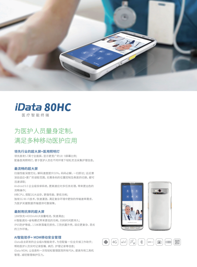 iData 80HC醫(yī)療智能終端為醫(yī)護(hù)人員量身定制,滿足多種移動醫(yī)護(hù)應(yīng)用。超大高清全面屏+醫(yī)用照明燈,專業(yè)的條碼掃描引擎+高效的數(shù)據(jù)傳輸,AI智能助手+MDM移動安全管理,更輕便、更安全、更耐用。