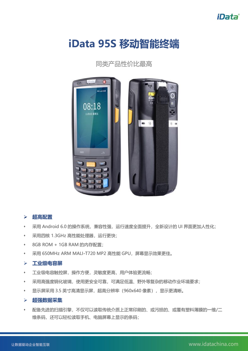 iData 95S智能終端,采用Android 6.0操作系統,四核1.25GHz高性能處理器,強勁流暢,更高效;工業(yè)超高清屏,室內室外,超清顯示;數據采集功能強大,多種無線通訊方式數據高效傳輸;大容量電池,堅固耐用,不受損傷;滿足全行業(yè)應用。