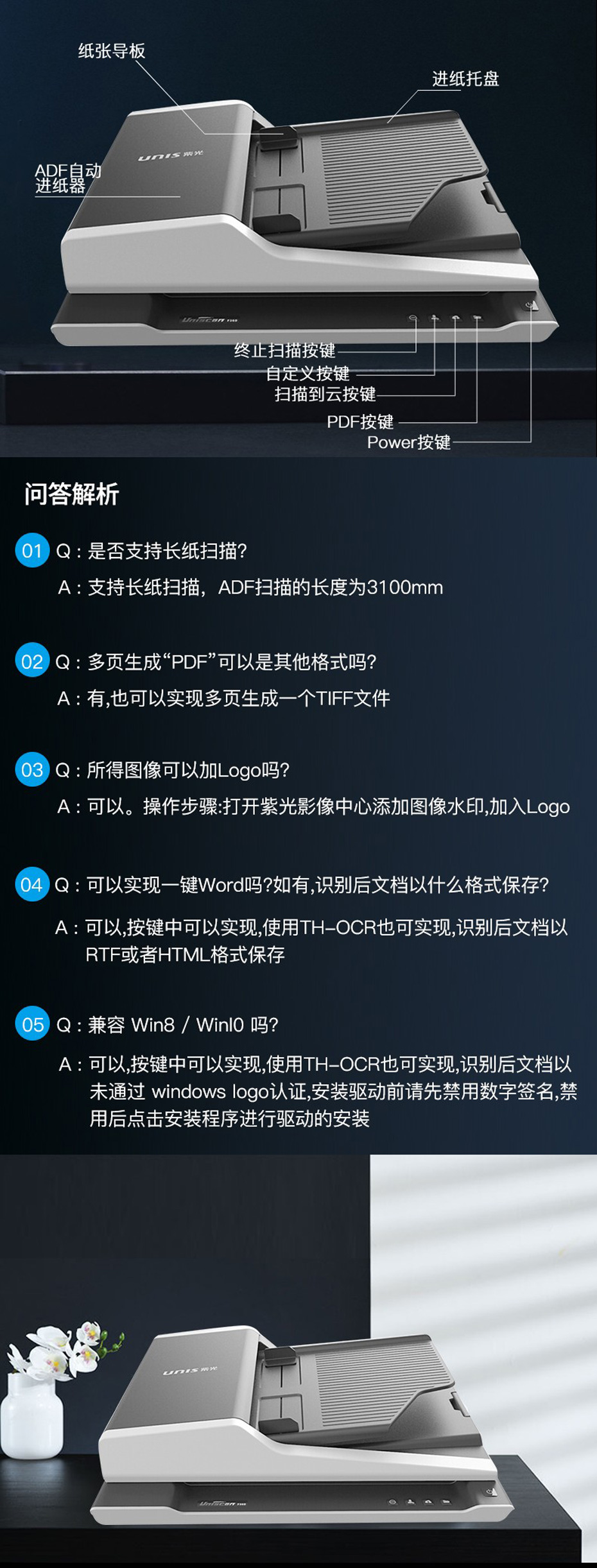 紫光(UNIS)F1110雙平臺掃描儀,采用采用“ADF+平板”雙平臺掃描,支持ADF高速掃描,讓辦公更高效。