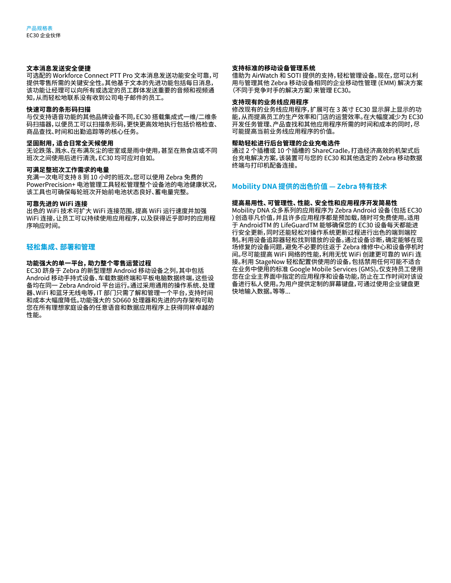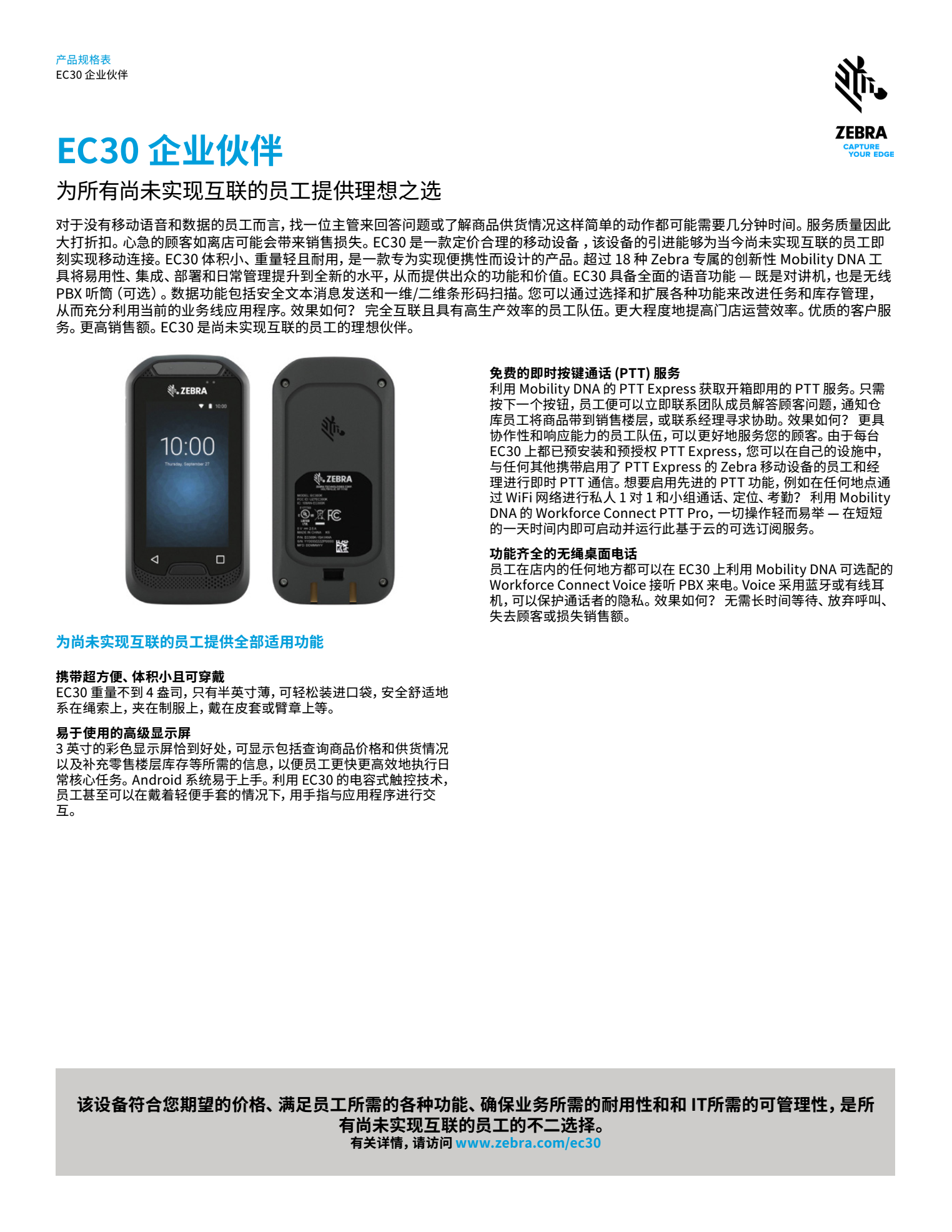 對(duì)于沒有移動(dòng)語(yǔ)音和數(shù)據(jù)的員工而言,向主管匯報(bào)工作或了解商品供貨情況等簡(jiǎn)單的行動(dòng)都需要花費(fèi)幾分鐘時(shí)間,影響服務(wù)質(zhì)量和銷售。EC30 這款移動(dòng)設(shè)備定價(jià)合理,該設(shè)備的引進(jìn)能夠?yàn)楫?dāng)今尚未實(shí)現(xiàn)互聯(lián)的員工即刻實(shí)現(xiàn)移動(dòng)連接。這款輕薄卻堅(jiān)固的小型設(shè)備可為您的員工提供所需的移動(dòng)語(yǔ)音和數(shù)據(jù)功能,幫助其提高核心日常任務(wù)的效率和準(zhǔn)確性。