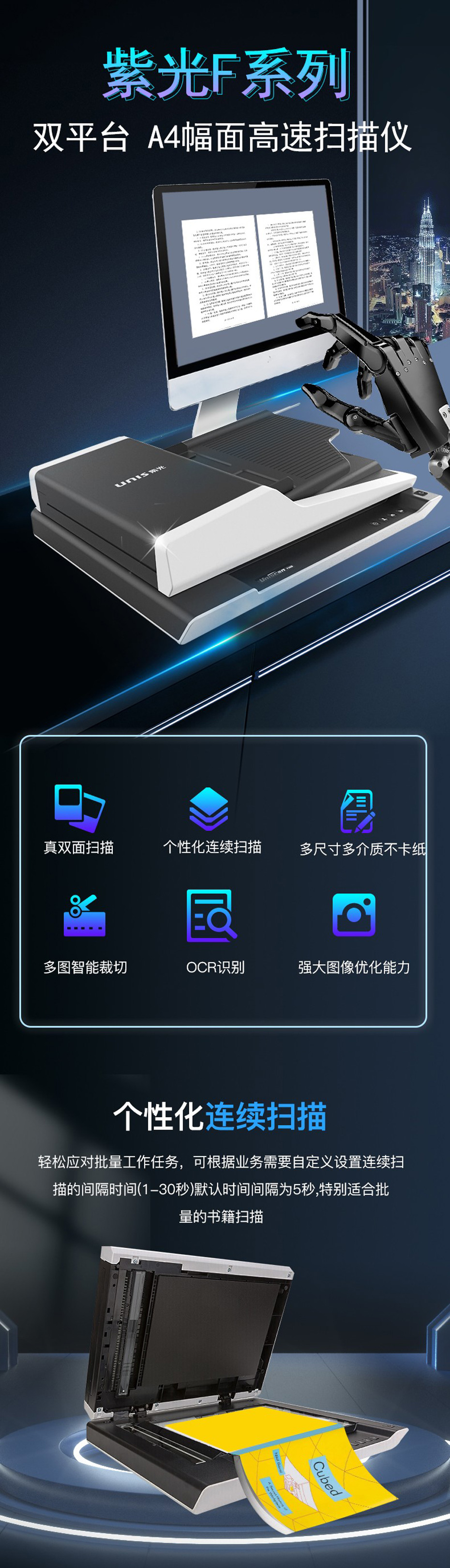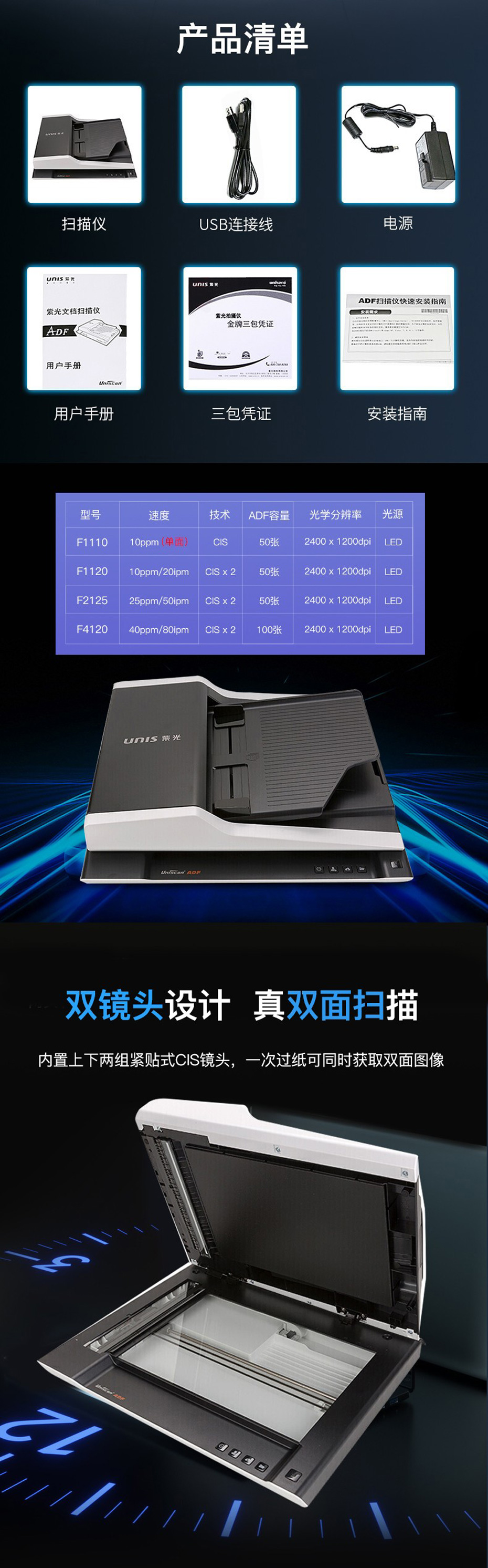 紫光(UNIS)A4幅面平板+ADF雙平臺掃描儀F1110